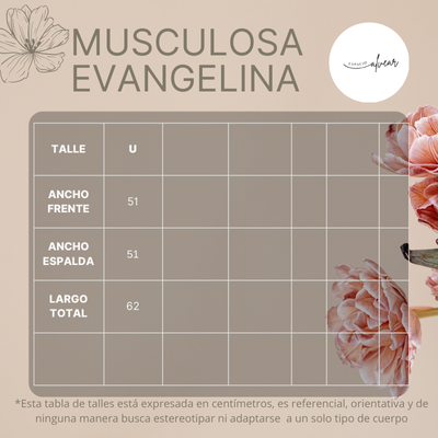 ¡Descubrí la Musculosa Evangelina! Su diseño fresco es ideal para lucir en cualquier ocasión, combinándola fácilmente con tus prendas favoritas. Perfecta para quienes buscan un básico versátil y con estilo, esta musculosa se adapta a tu cuerpo y aporta un toque moderno a tu look diario. ¡No te quedes sin la tuya y sentite cómoda y a la moda todo el día!
